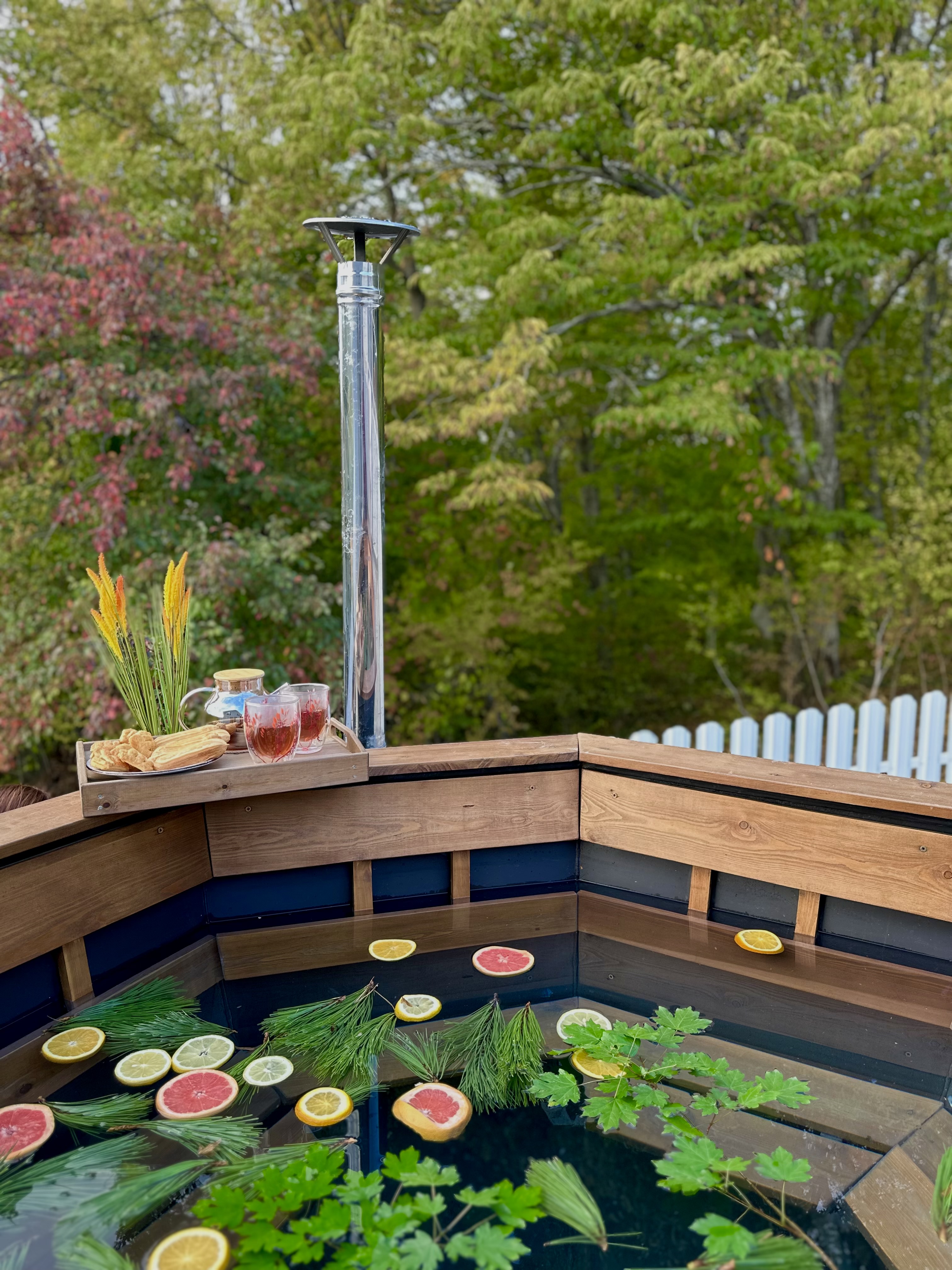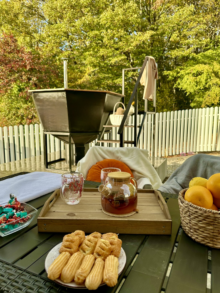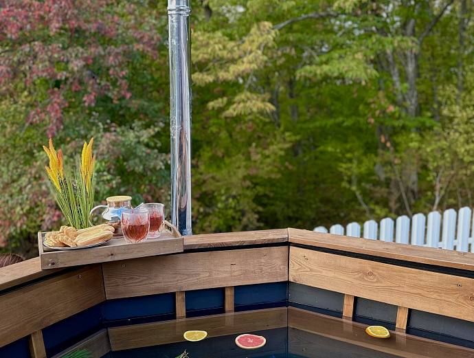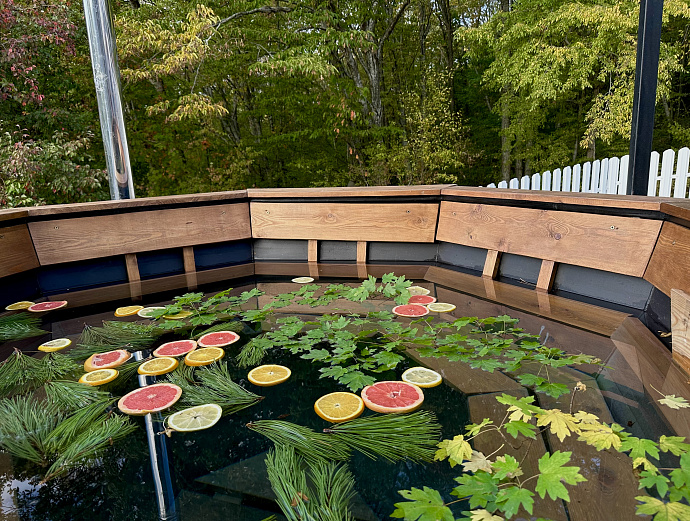 Банный чан на дровах. Приятное тепло, мягкое освещение и шелест листвы вокруг создают уникальную атмосферу отдыха. Наблюдать за звездами, наслаждаясь обволакивающим теплом воды — настоящее удовольствие.