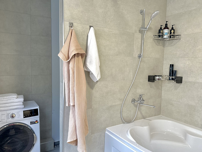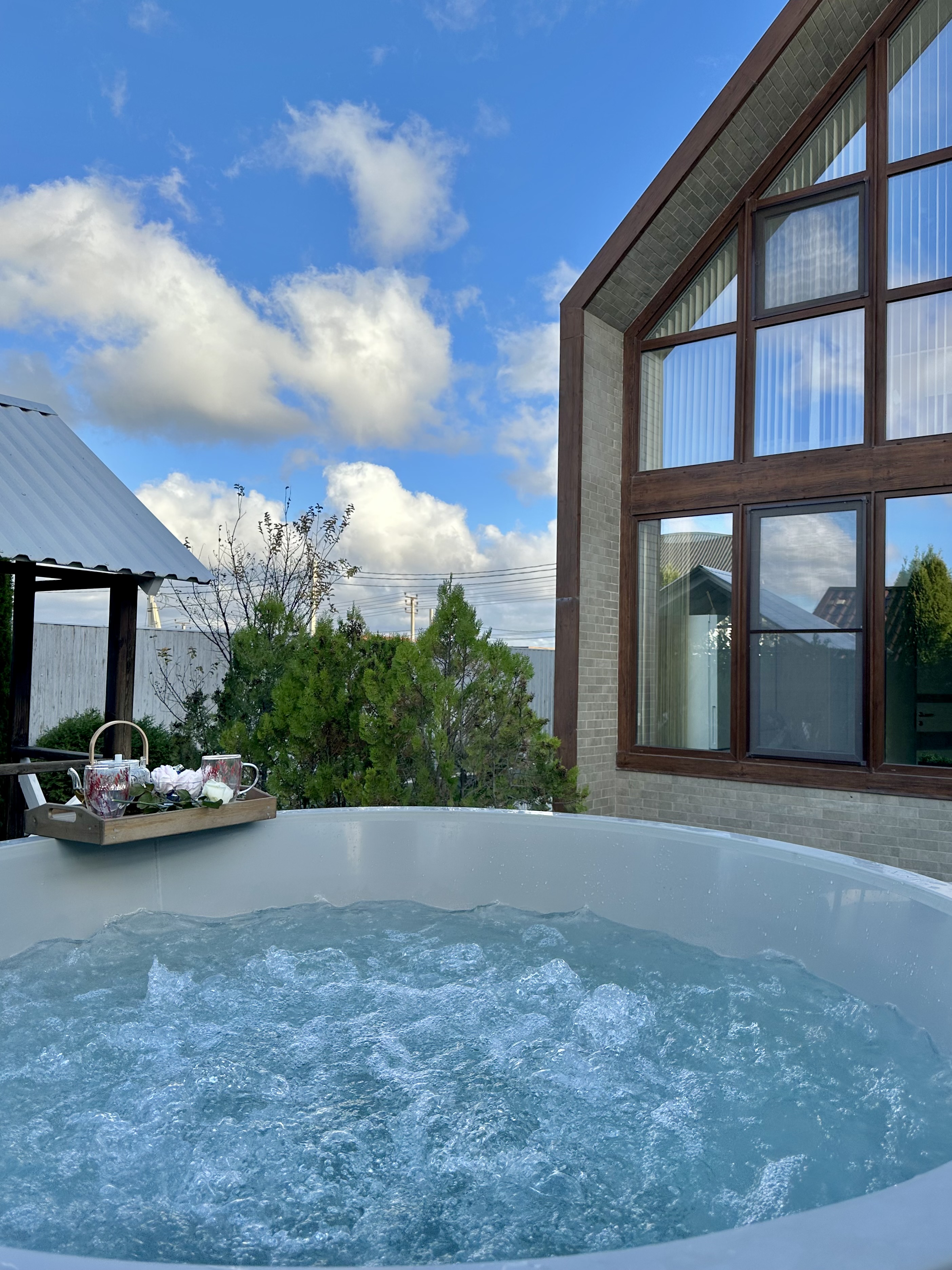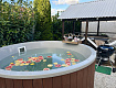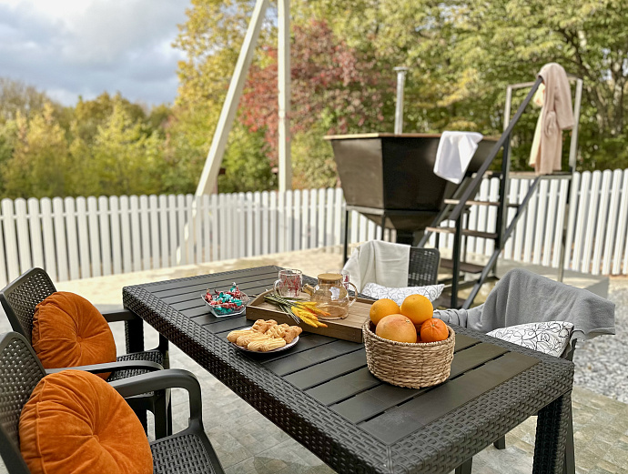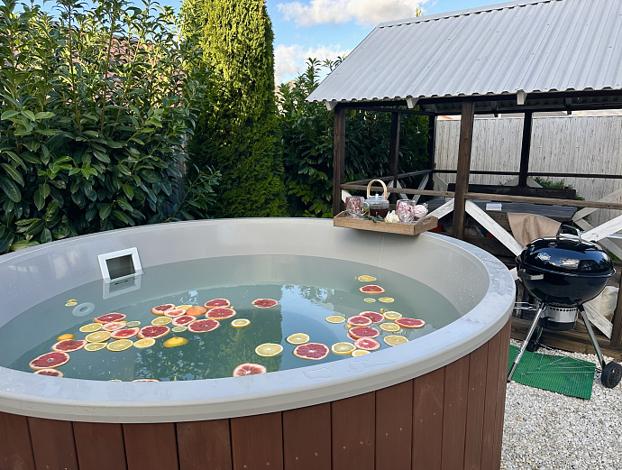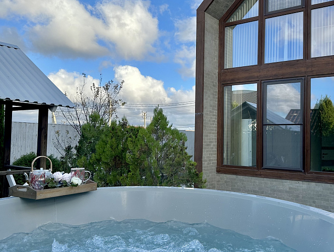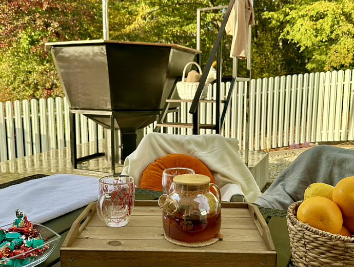 Подогреваемая купель с аэромассажем и подсветкой. Возможность расслабиться под открытым небом, наблюдая за звездами, слушая шелест листвы и пение птиц — незабываемо.