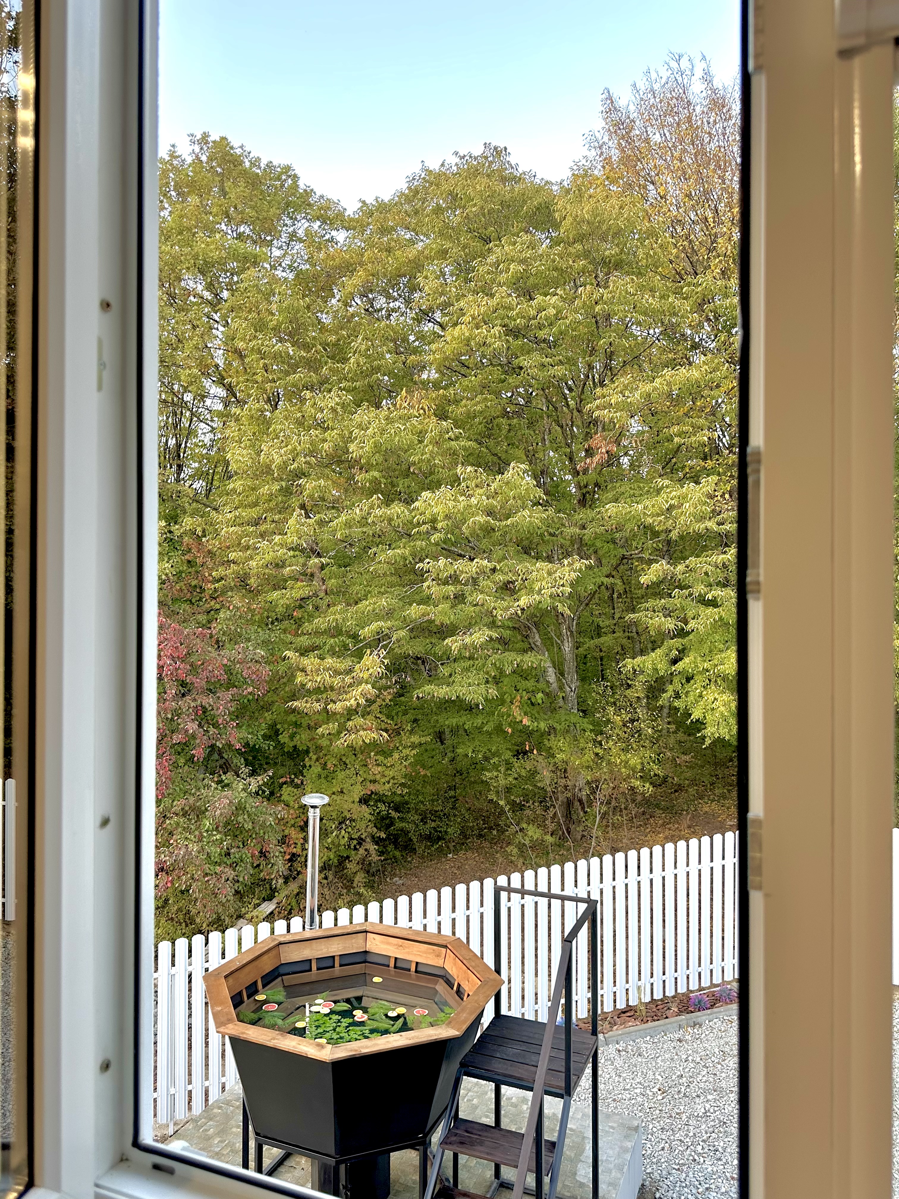 Дом с подогреваемой купелью, уютным двориком и выходом в лес.