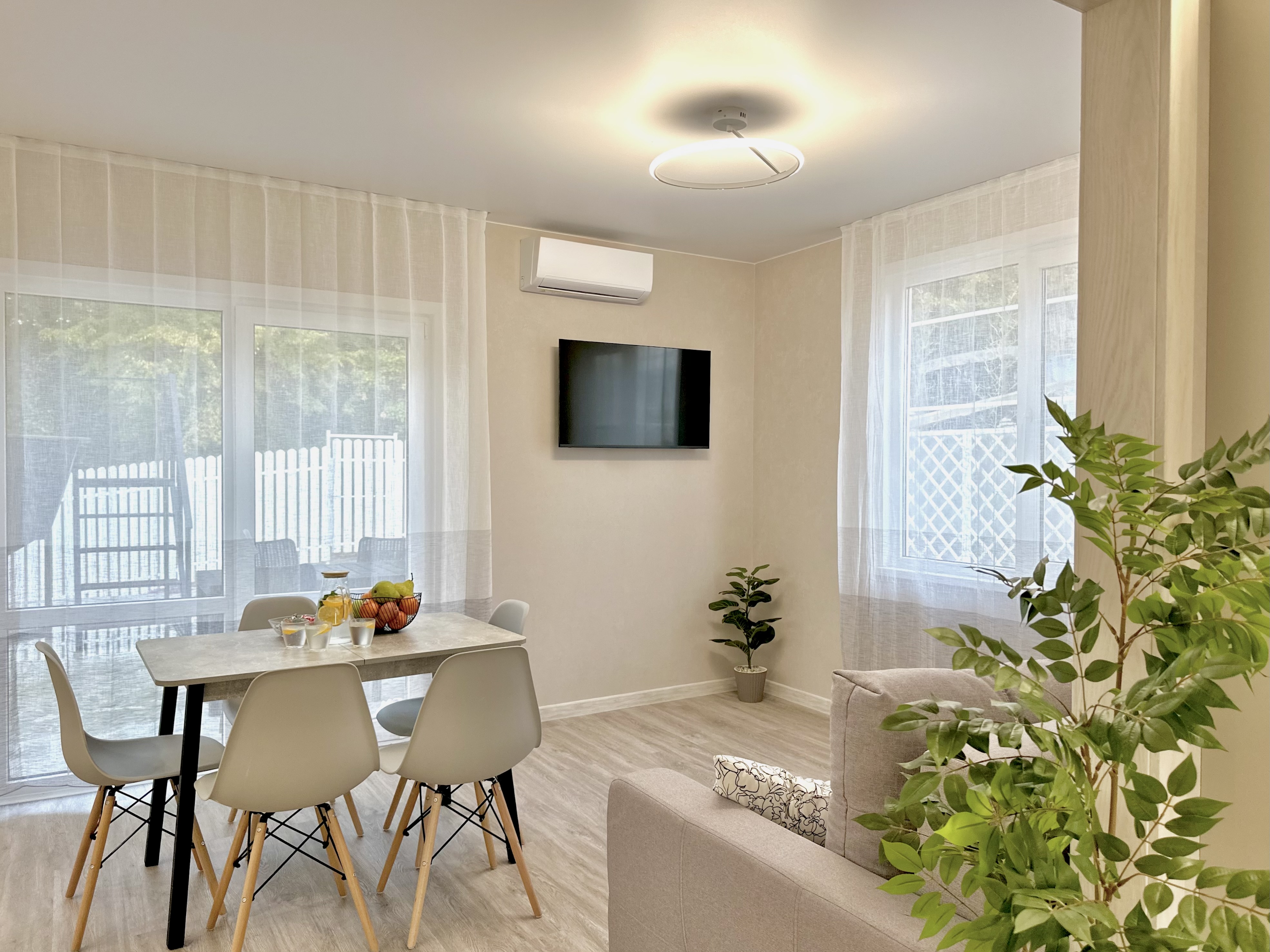 Из кухни-гостиной открывается вид на уютный дворик с озеленением и беседками.